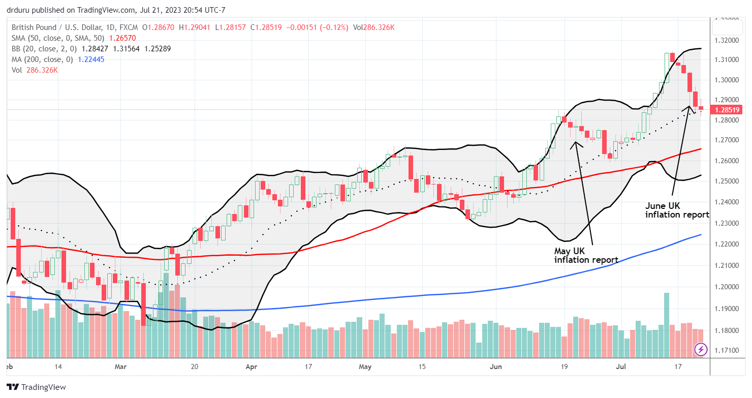 The cooling overall inflation numbers cooled the heels of the British pound which has been on quite a streak since the bond and currency crisis 10 months ago. GBP/USD, also Invesco CurrencyShares British Pound Sterling Trust (FXB), was falling off a near 16-month high coming into the inflation print. The inflation report greased the skids on the way to an important test of the uptrending 20-day moving average (DMA). That line has held as support since the beginning of June and has been important support since early March.