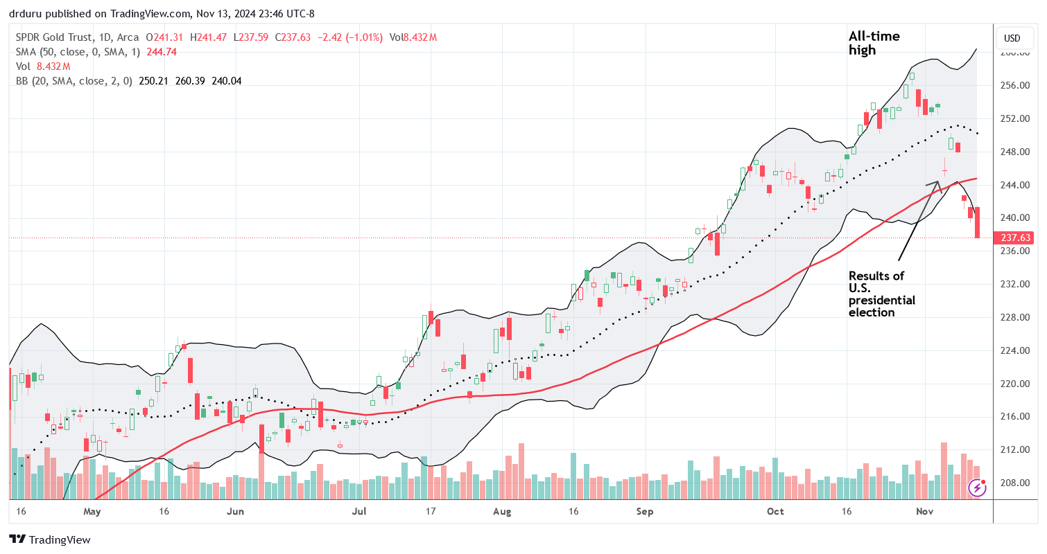Two months ago I interpreted the strength in gold as indicative of a skepticism about the Fed’s implied victory message on inflation. That trend persisted until last week. The resolution of the U.S. presidential election generated a fresh surge in Bitcoin (BTC/USD) and presumably drained interest in gold. The SPDR Gold Trust (GLD) gapped down and lost 3.0%. I was hopeful that the 50-day moving average (DMA) (the red line below) would hold as support. As a (perma) bull on gold, I added call options to supplement my core GLD position. Today’s 1.0% loss in GLD further confirmed a 50DMA breakdown. This bearish technical signal means that I am unlikely to try new short-term trades for a while.