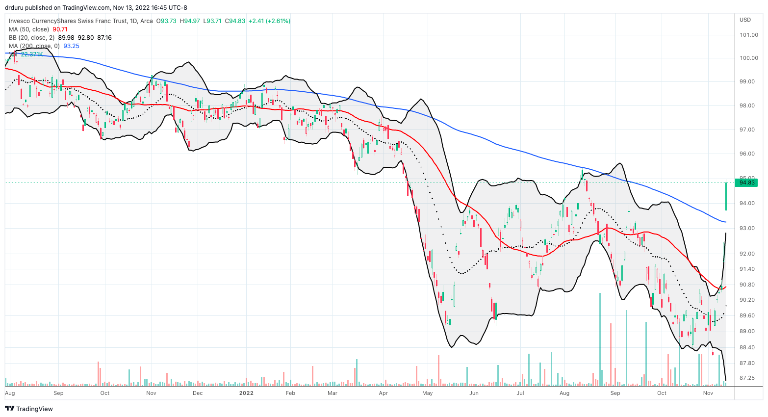 Swiss National Bank (SNB) Chairman Thomas Jordan made headlines two days ago in a speech where he insisted that the SNB “will take all measures necessary to bring inflation back into the territory of price stability.” Jordan noted that the current rate, 0.5%, is not restrictive enough to get inflation back into the target range. The Swiss franc surged on a day where the U.S. dollar was already in a deep sell-off after a slightly lower than expected U.S. CPI inflation report. The combined effect completed a reversal for USD/CHF back to the August lows. The below chart from TradingView.com of Invesco CurrencyShares Swiss Franc Trust (FXF) shows a bullish 200-day moving average (DMA) breakout to end the week. FXF gained 2.6% a day after gaining 2.0%.