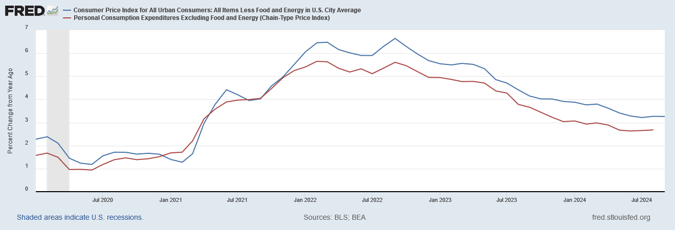 Sources: U.S. Bureau of Labor Statistics, Consumer Price Index for All Urban Consumers: All Items Less Food and Energy in U.S. City Average [CPILFESL], retrieved from FRED, Federal Reserve Bank of St. Louis, October 10, 2024. U.S. Bureau of Economic Analysis, Personal Consumption Expenditures Excluding Food and Energy (Chain-Type Price Index) [PCEPILFE], retrieved from FRED, Federal Reserve Bank of St. Louis, October 10, 2024.