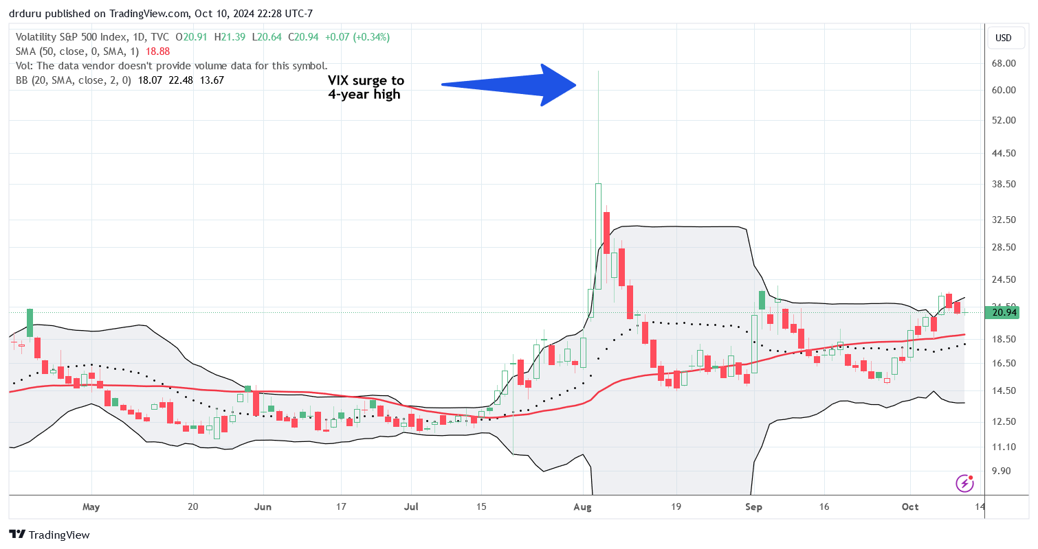 While both shorting bonds and going long the dollar have been profitable trades, the most interesting trading action sits with the S&P 500 (SPY). Despite rising long-term bond yields, the index managed to break out to a fresh all-time high. The September CPI report barely knocked the index off its all-time high. The S&P 500 seems to have a mind of its own and is hardly paying attention to much at all over time. Even the recent increase in the volatility index (VIX) has barely fazed the S&P 500. Moreover, this strengthening bullish appearance is happening during a time which represents the third of the stock market’s most dangerous months.